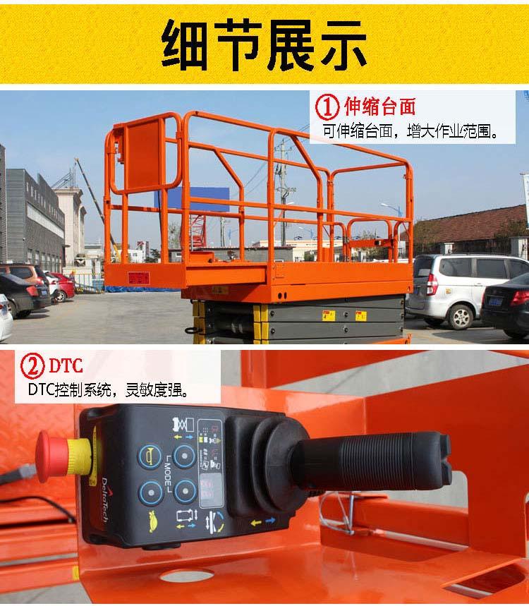 自行式升降作業平臺自身具有行走和升降功能,用控制手柄控制行走方向,行走可調速并有剎車裝置,用電瓶帶動直流電機進行行走和升降,也可選用交流電機和柴油機進行行走和升降,還可選用無線電子遙控器進行升降,不需人工牽引,不需外接電源,移動靈活方便,使高空作業更方便快捷,是現代企業安全生產理想高空作業的設備。