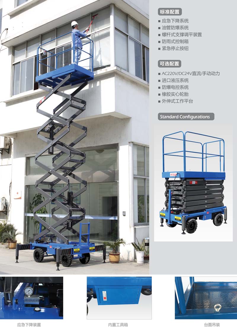 移動剪叉式升降機是用途廣泛的高空作業裝備,該產品適用于各行業高處設備安裝、檢驗、維修、裝飾等可移動性高空作業。